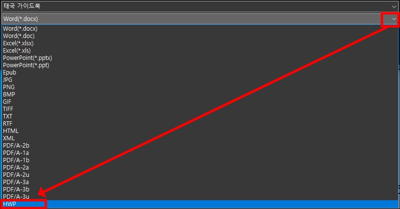 3) 아래와 같은 화면이 나오면, 변환하기 원하는 파일 형식을 선택해 주세요. 우리는 PDF파일을 한글파일로변환 하기 원하는 것이기에, 아래한글 확장자인 HWP를 선택합니다.