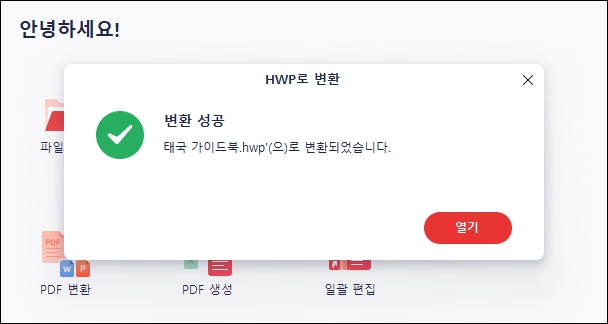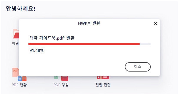 5) 아래와 같이 PDF파일이 한글파일로 변환되는데, 파일의 크기에 따라 변환 시간이 달라집니다. 보통 10장 이내의 PDF 파일은 1초 이내에 변환이 완료됩니다.