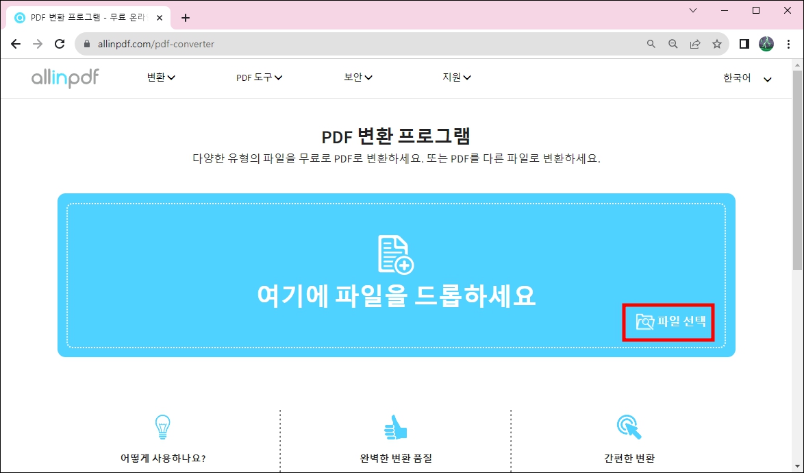 아래와 같이 PDF 변환 프로그램이 나오면, 파일 선택을 클릭해 주시거나 원하는 파일을 마우스로 드로그 앤 드롭을 해주시면 됩니다. 드로그앤 드롭을 모르시면 그냥 파일 선택을 눌러 주세요.