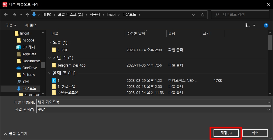 4) 아래와 같이 파일 이름과 파일 저장 위치도 지정이 가능합니다. 모두 지정을 하였다면 저장 버튼을 눌러 PDF파일을 한글파일로변환을 마무리합니다.
