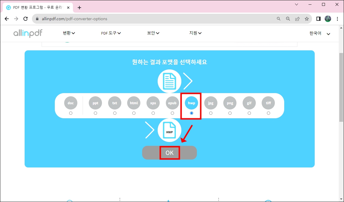 자 아래와 같은 화면이 나오면, 원하는 파일 형식을 선택하시면 되는데, 우리는 PDF파일을 한글파일로변환을 원하기 때문에, HWP를 선택하시고 OK 버튼을 눌러 주세요.