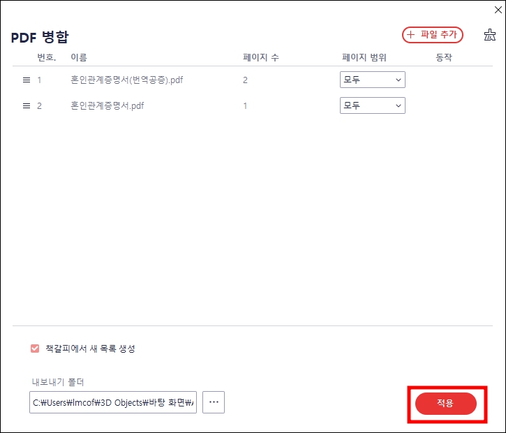 6) pdf 파일을 선택하셨다면 pdf파일 합치기를 위해 적용 버튼을 눌러 주세요.